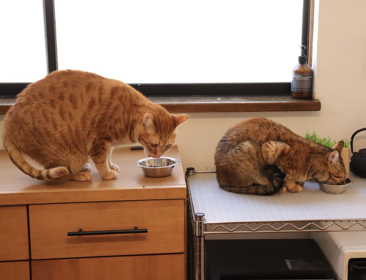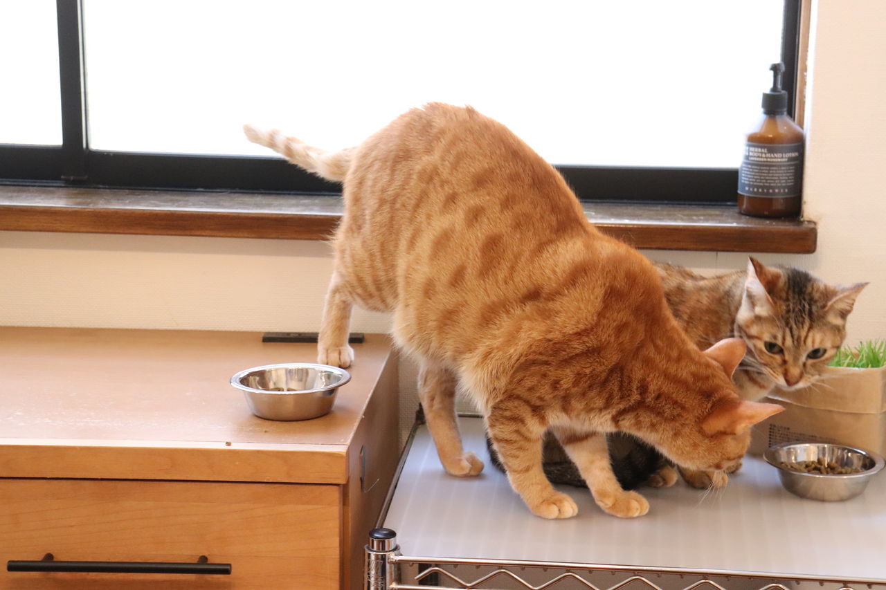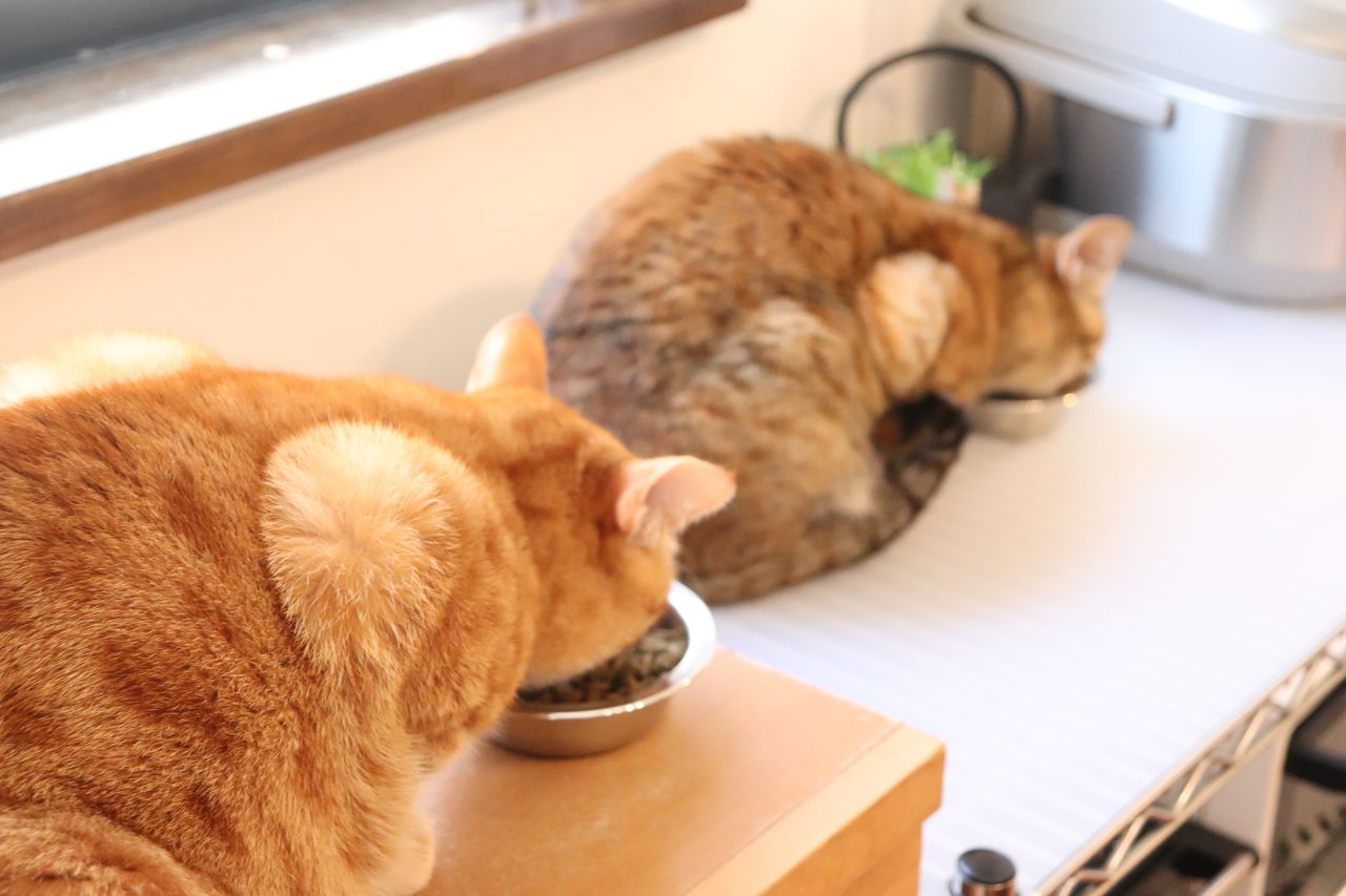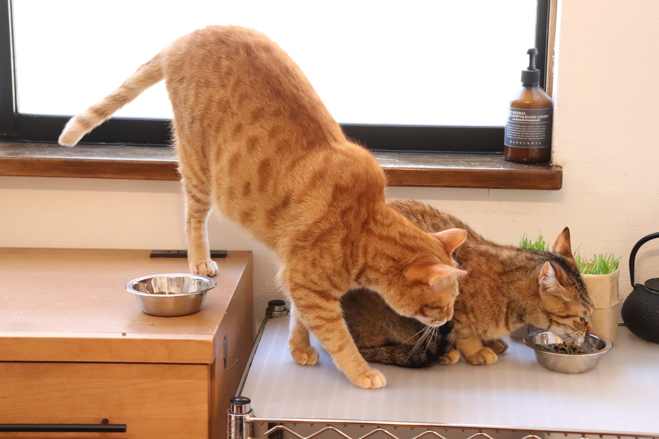 ■猫のシンクロ 整列して食べる猫■