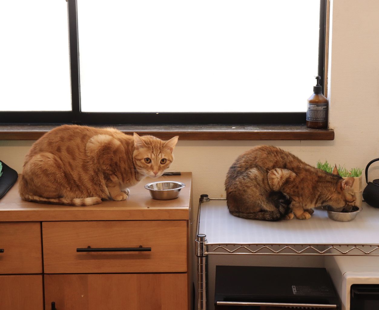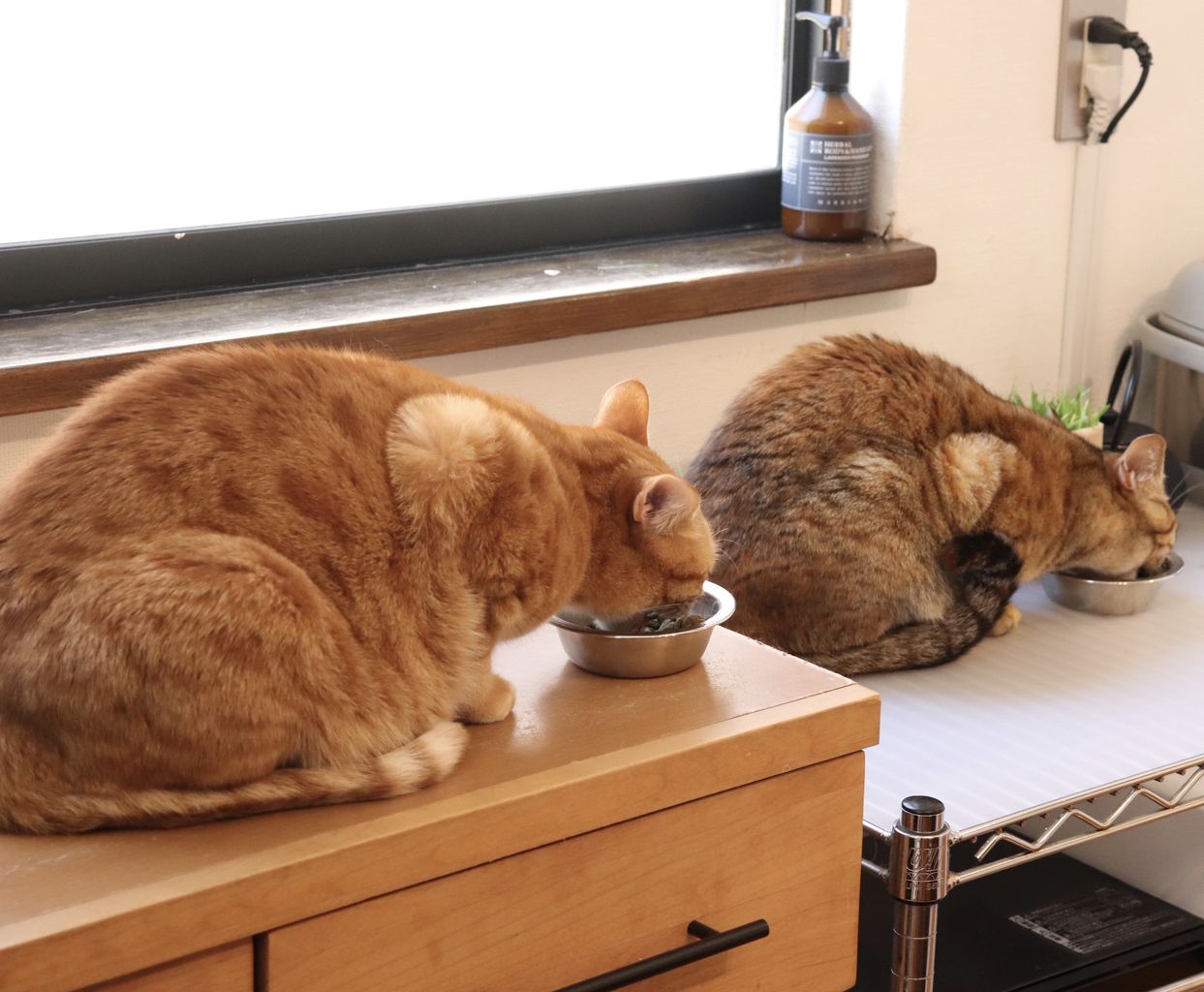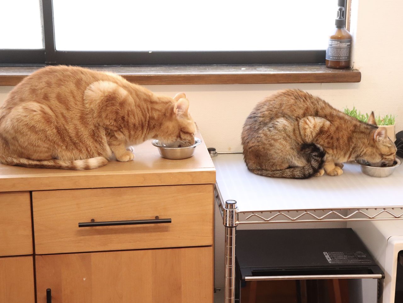 ■猫のシンクロ 整列して食べる猫■