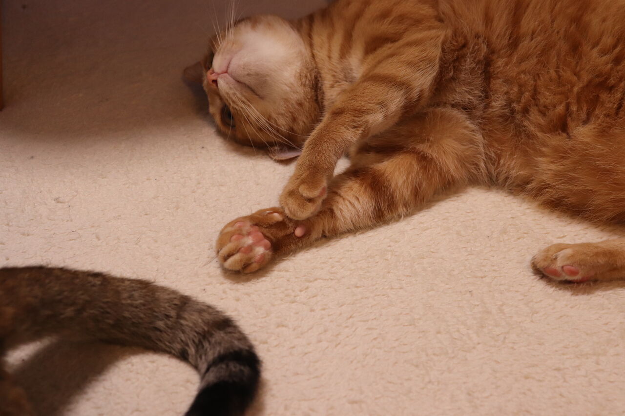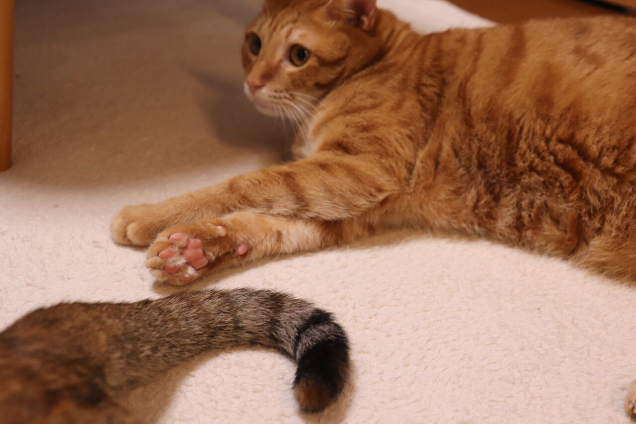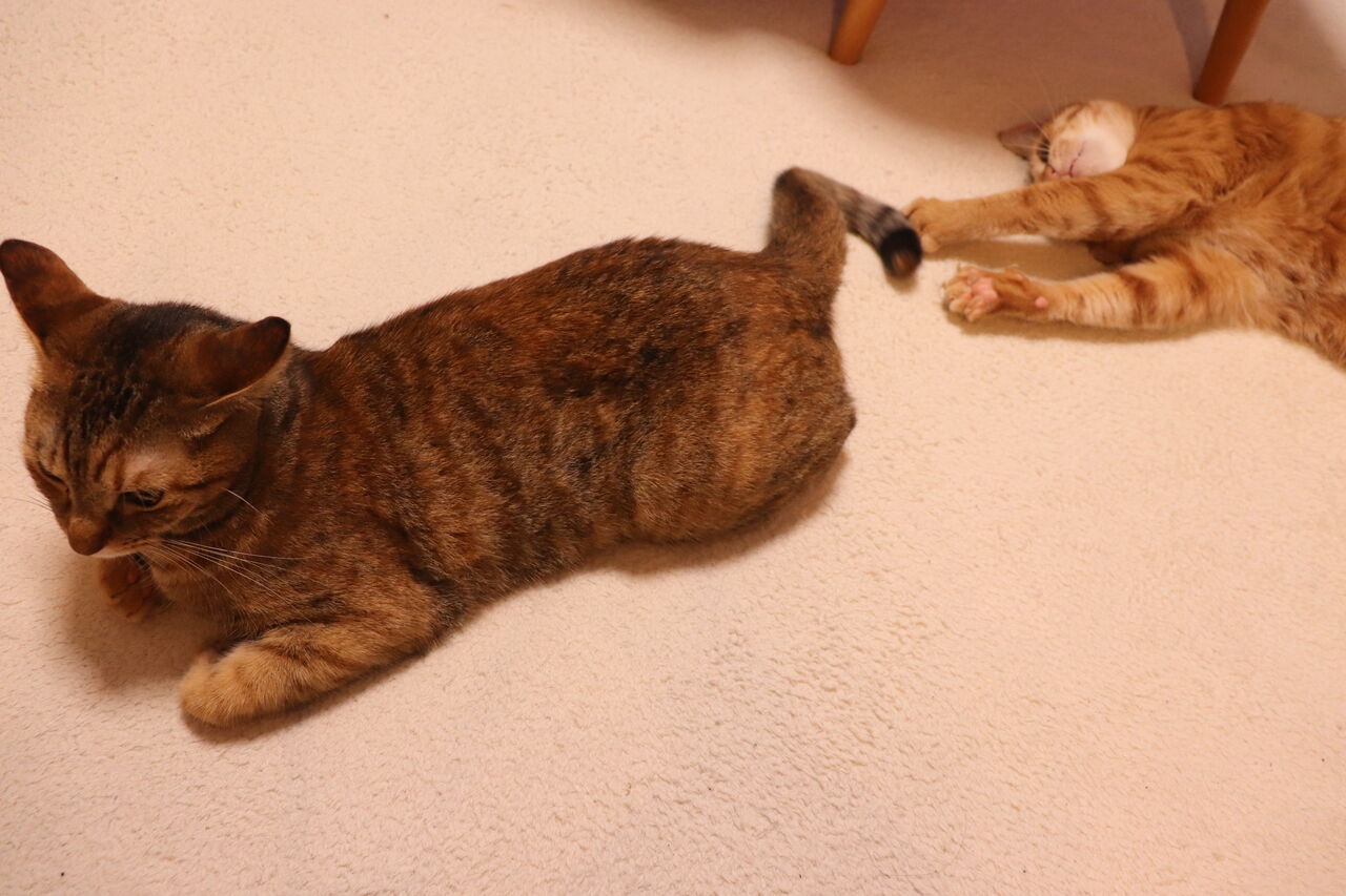 尻尾で遊ぶ猫